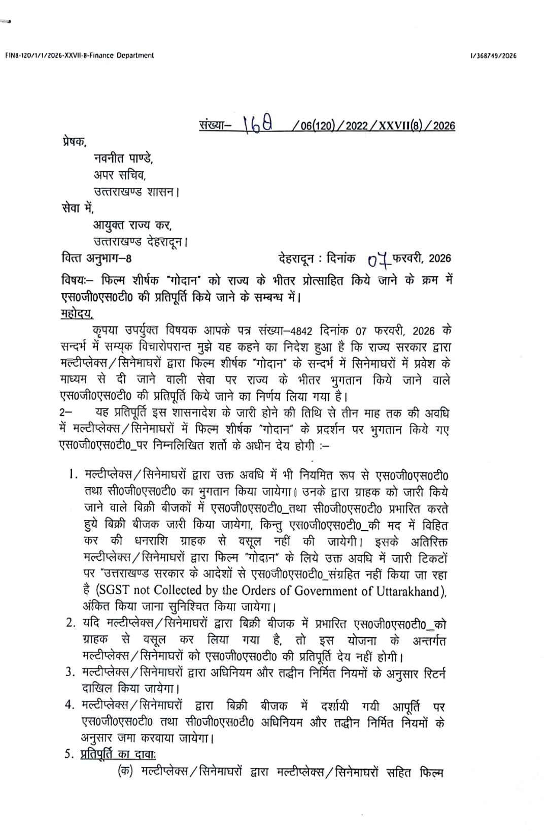 देहरादून 7 फ़रवरी 2026: ग्रामीण जीवन और गोवंश के महत्व पर आधारित फिल्म ‘गोदान’ को उत्तराखंड राज्य में टैक्स फ्री कर दिया गया है। इस संबंध में शासनादेश जारी कर दिया गया है, जिसके साथ ही यह निर्णय प्रदेशभर में तत्काल प्रभाव से लागू हो गया है।