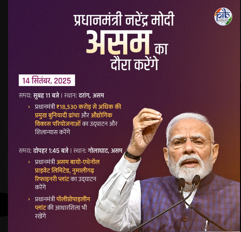 प्रधानमंत्री नरेंद्र मोदी 14 सितंबर को करेंगे असम का दौरा।