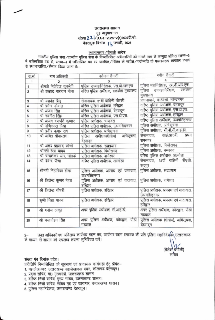 इसी क्रम में पुलिस विभाग में प्रशासनिक स्तर पर आवश्यक तबादले किए गए हैं। यह कदम पुलिस व्यवस्था को और अधिक सक्रिय, जवाबदेह और प्रभावी बनाने की दिशा में उठाया गया है।